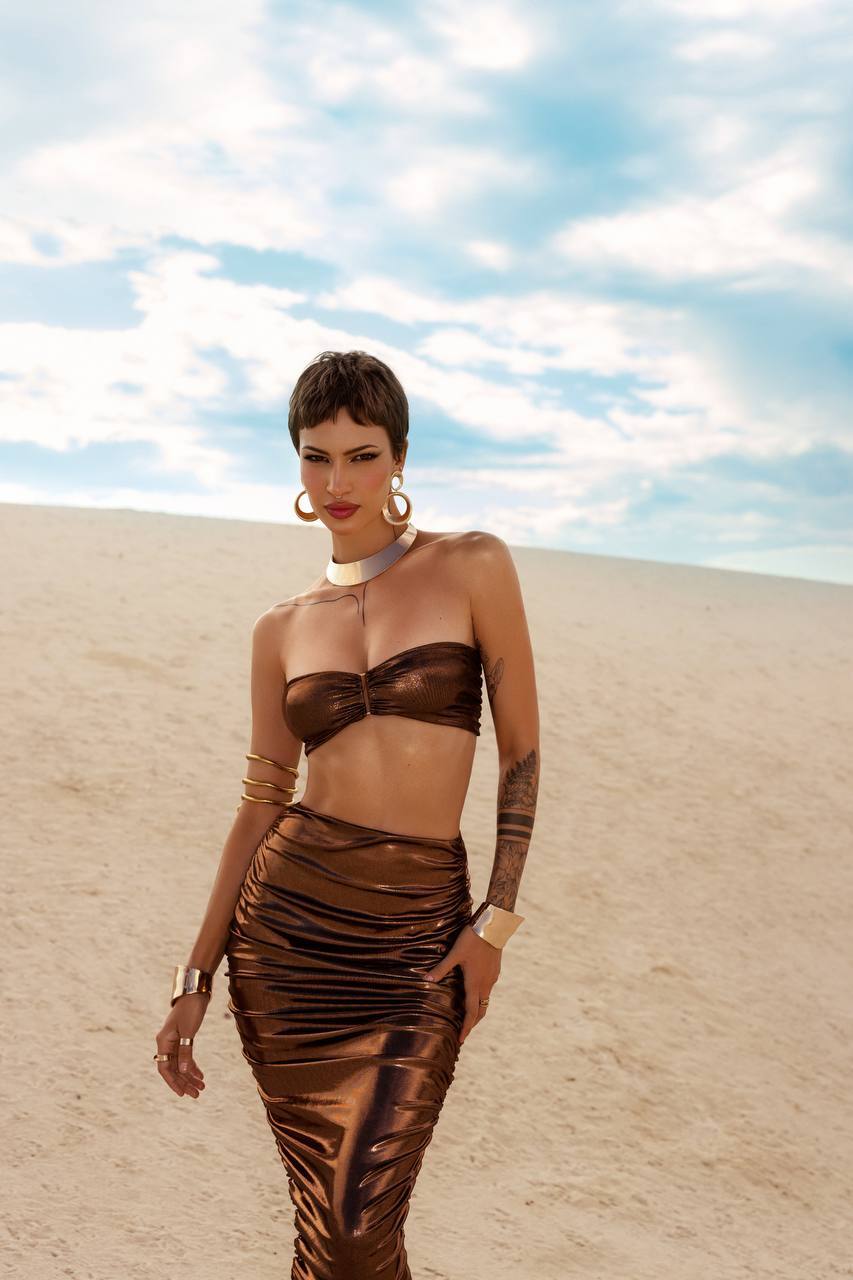 Юбка выполнена из эластичного трикотажа, на боковых частях вшиты резинки, что придает форму красивой складке вниз. Длина юбки миди